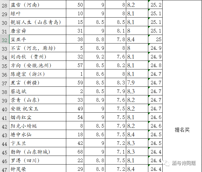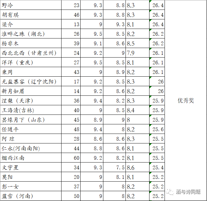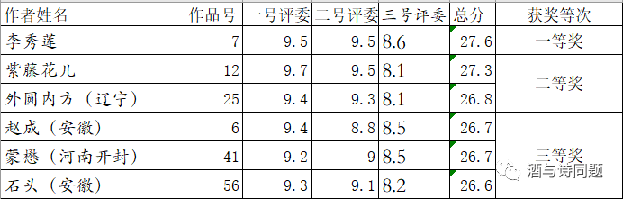 “酒与诗”《柳溪谷》全国征文大赛 | 获奖名单 本次“酒与诗”《柳溪谷》全国征文大赛自2023年1月8日启动至2月9日结束,加上后期遗漏稿件共收到全国各地360余位作家、诗人投稿,经审核有效稿件为214件。所有作品经过初评、终评打分评出一等奖1名,二等奖2名,三等奖3名,因其中三位作者分数一致,故评出优秀奖21名,提名奖29名。现将获奖作者名单公布如下: 恭喜以上获奖作者,感谢支持“酒与诗”的各位老师!