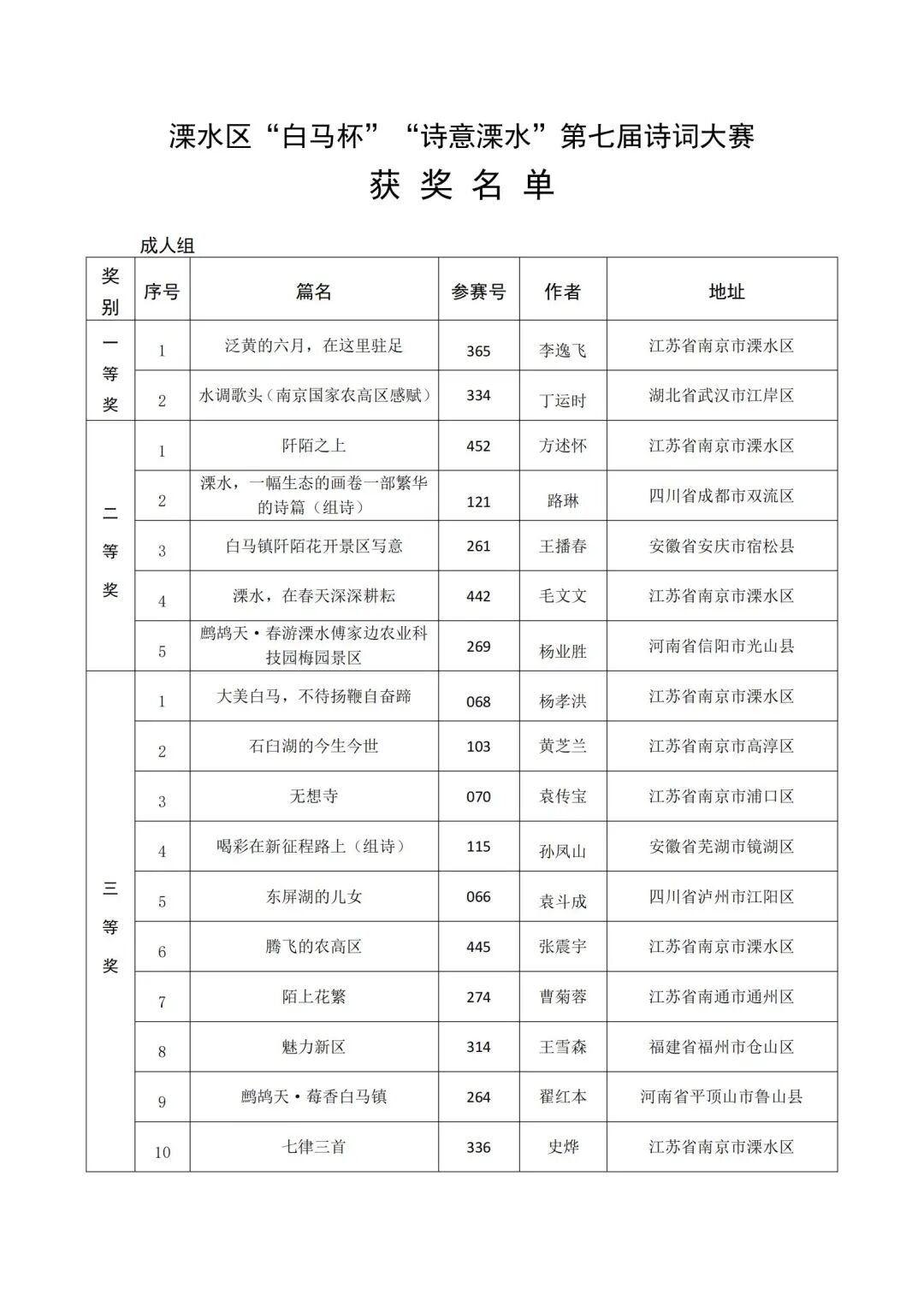 2022年7月8日,溧水区“白马杯”“诗意溧水”第七届诗词大赛组委会发布征稿启事,截止到截稿时间(9月15日)共收到参赛作品2091件,其中成人组共收到来自31个省份的1153件作品。