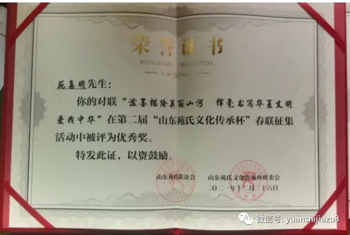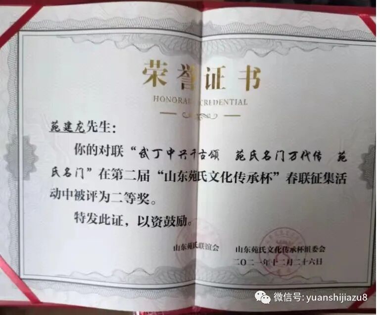 第三届“山东苑氏文化传承杯”春联征集活动日前启动,面向省内外苑氏家人征集春联。这是山东苑氏联谊会连续第三年举办春联征集活动,旨在以写春联送祝福为载体,弘扬苑氏文化,传承家族精神,展现苑氏族人家国情怀和文化底蕴,促进苑氏家人家族认同感,凝聚亲情,增进感情,加强交流,丰富苑氏家人文化生活。本届春联征集活动特邀宛姓宗亲参加,籍此促进苑、宛两姓交流联谊,共同推动姓氏寻根活动的深入开展。宛姓宗亲会秘书长宛福成教授曾为第一届“山东苑氏文化传承杯”春联征集活动发来贺信,并亲自撰写对联以示为祝贺和支持。